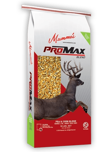 Mumme’s 14% Promax Blend is a true 50% corn / 50% peas mix that is designed to be fed out of a broadcast feeder; thanks to the texture of the grains, it will not clog your feeder. The Pro/Max Blend utilizes the same apple scent that is in the Mumme’s deer corn to attract your wildlife. Pro/Max also provides a 14% protein content during the season so you are able to keep your protein supplement program going all year long.